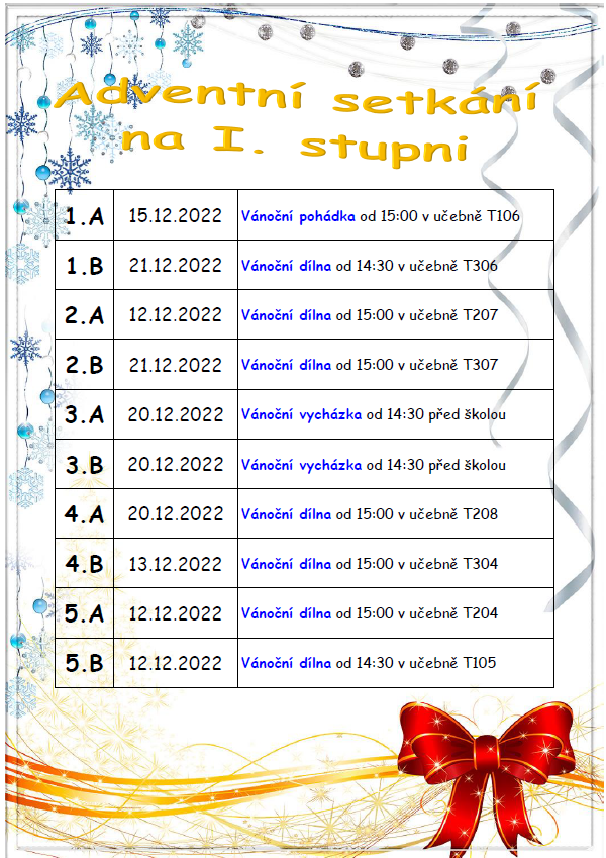 paní učitelky z I. stupně připravili pro každou třídu předvánoční setkání. O akci budete včas informováni a budeme se těšit, že i v této době si najdete chvíli na společné setkání a naladíte se s námi na Vánoce.