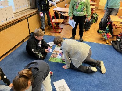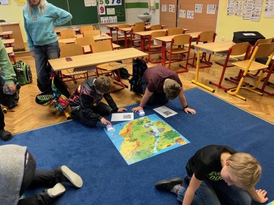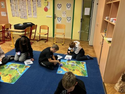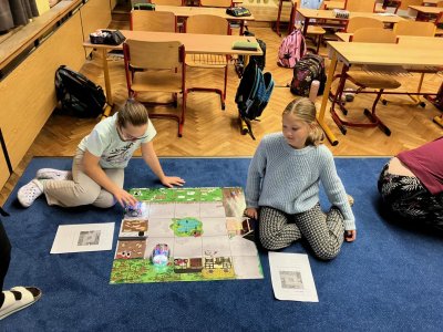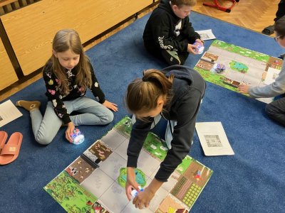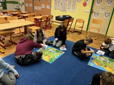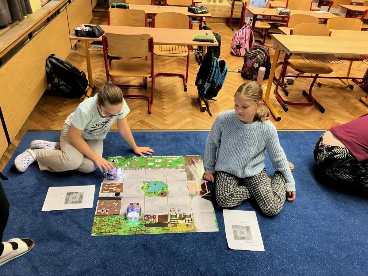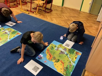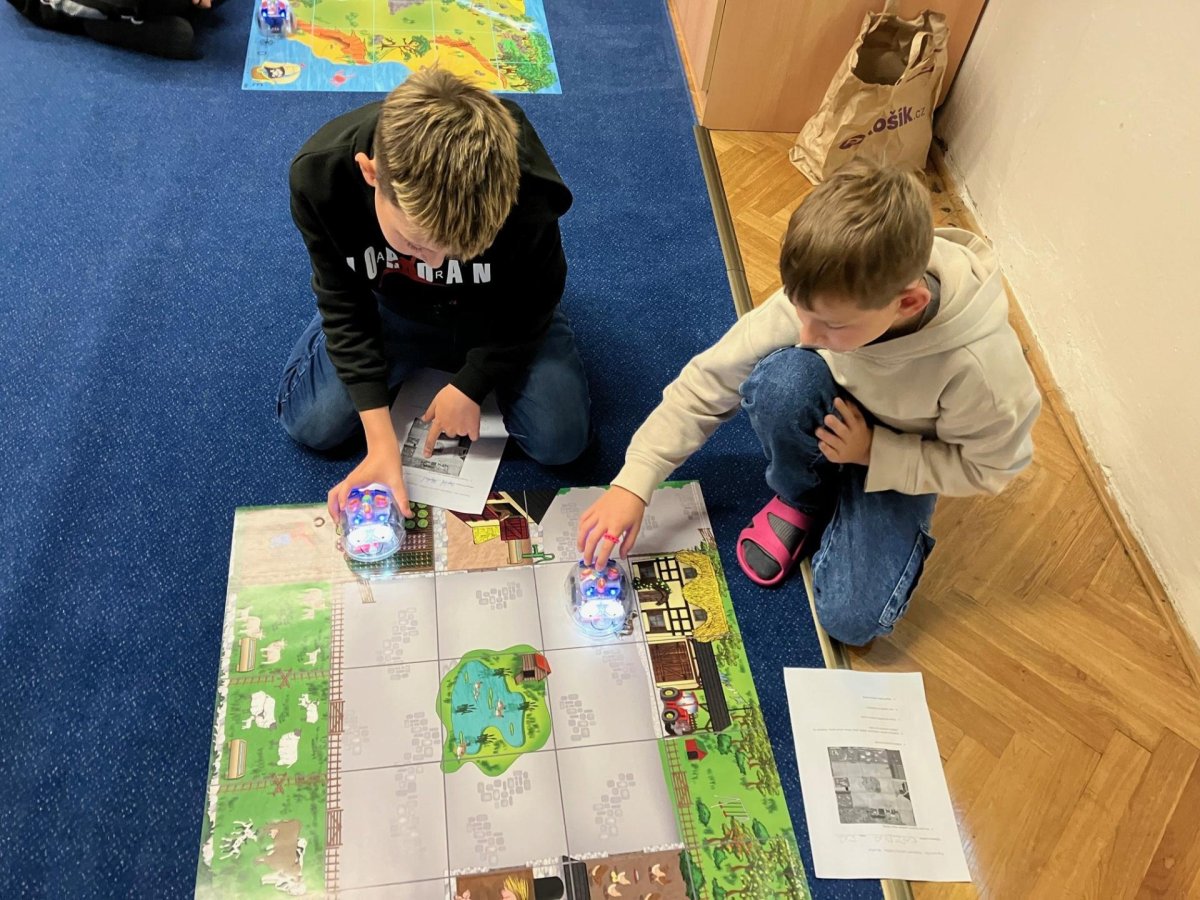 Zkoušíme kódovat pomocí robotů BlueBot. Plníme úkoly na mapách a poznáváme, jak opravovat chyby v programu.